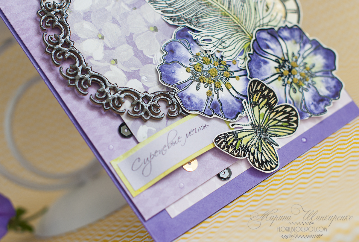 Листівчока про бузкові мрії. Квіти, метелики.. Чорна журна чіпбордова рамочка чудово відтіняє всю ніжність і тендість.
